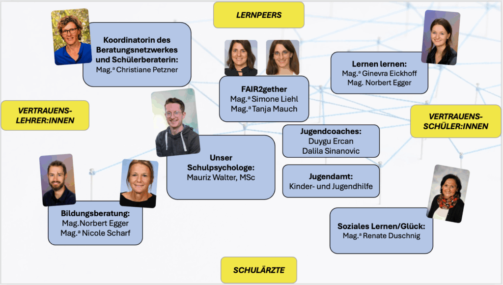 | über Studien- und Berufsprofile | bei schulischen und privaten Problemen | durch den „Lernen lernen“-Workshop in den ersten Klassen |